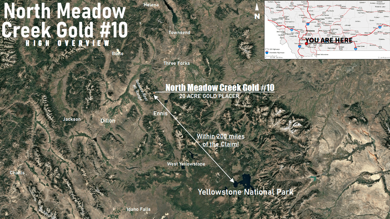 Two hour's drive from Yellowstone National Park, the North Meadow Creek (NMC) Gold #10 claim is found capturing all the gold in the valley leading up to the foot of the beautiful Tobacco Root Mountains! Downstream from past producers like the Kidd Mine with high-grade gold and silver ores, this mountain river placer profits from the natural erosion of an entire mountain's worth of minerals down into its river waters!
