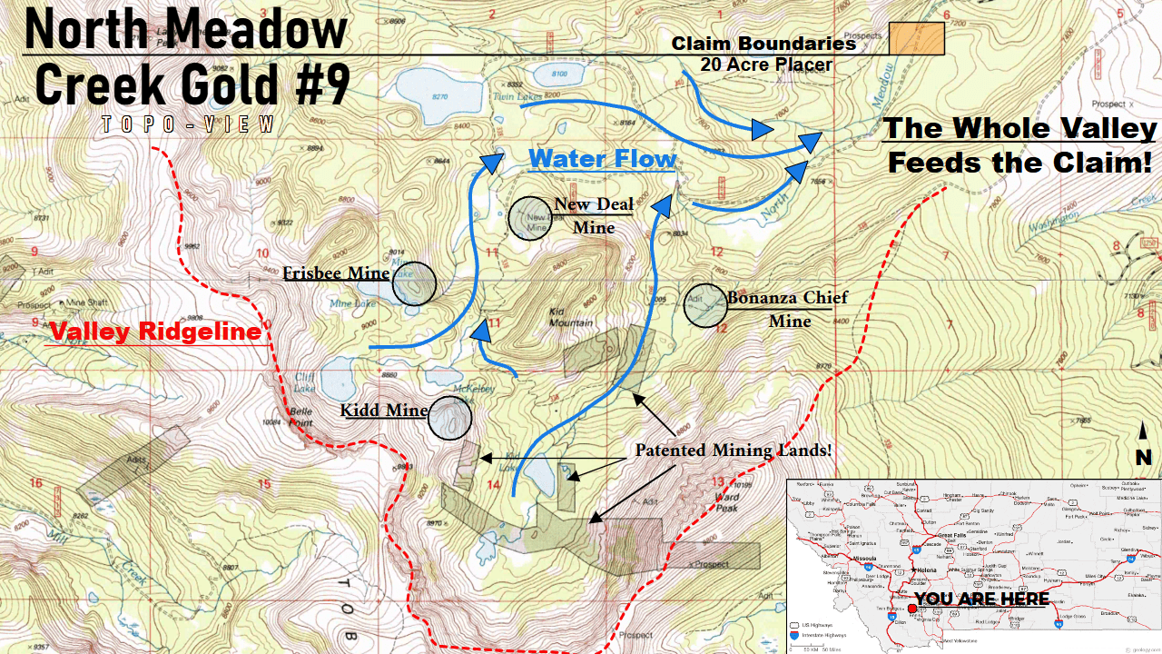 Capturing the rain and snow run-off from mountains where the Kidd Mine, the Frisbee Mine, and the New Deal Mine all sit, the North Meadow Creek Gold #9 claim captures all the treasures further up the mountain! From the Kidd Mountain flows native gold and silver, but also copper-rich and colorful "peacock ore" bornite, and the fiery-orange "ruby blend" sphalerite. Once the gold-laden ores flow past the NMC Gold #9 claim, they continue nearly 12.5 miles downstream onto patented placer grounds like the Cibola VIII and the North Meadow Creek Placers, before they finally tumble and become lost to the depths of Ennis Lake. The NMC Gold #9 acts as the gateway between what comes down the mountain and what'll be left to fall downstream!