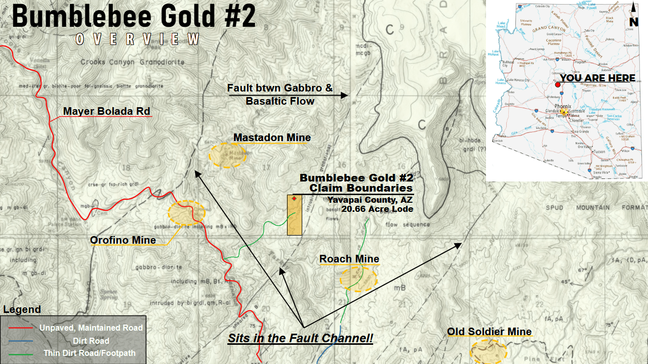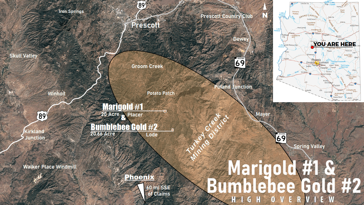 In the heart of Arizona's Turkey Creek Mining District lie the Marigold #1 & the Bumblebee Gold #2; 20-acre placer and 20.66 acre lode claims!  These claims are the envy of local miners: In an area where patented and unpatented claims stretch for miles chasing the rich, feet-thick veins found across the Turkey Creek Mining District, staking new unpatented mining claims in this area is almost impossible - and getting your hands on one in this area is a rare opportunity!