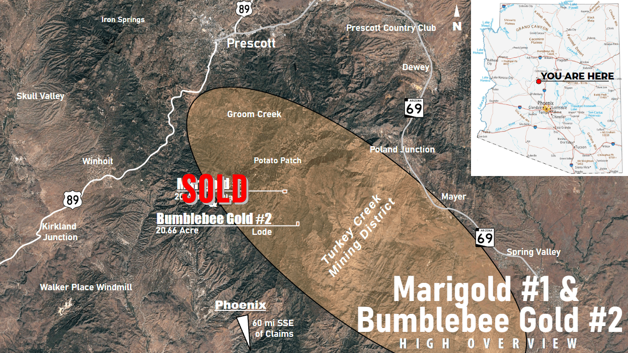 In the heart of Arizona's Turkey Creek Mining District lie the Marigold #1 & the Bumblebee Gold #2; 20-acre placer and 20.66 acre lode claims! These claims are the envy of local miners: In an area where patented and unpatented claims stretch for miles chasing the rich, feet-thick veins found across the Turkey Creek Mining District, staking new unpatented mining claims in this area is almost impossible - and getting your hands on one in this area is a rare opportunity!