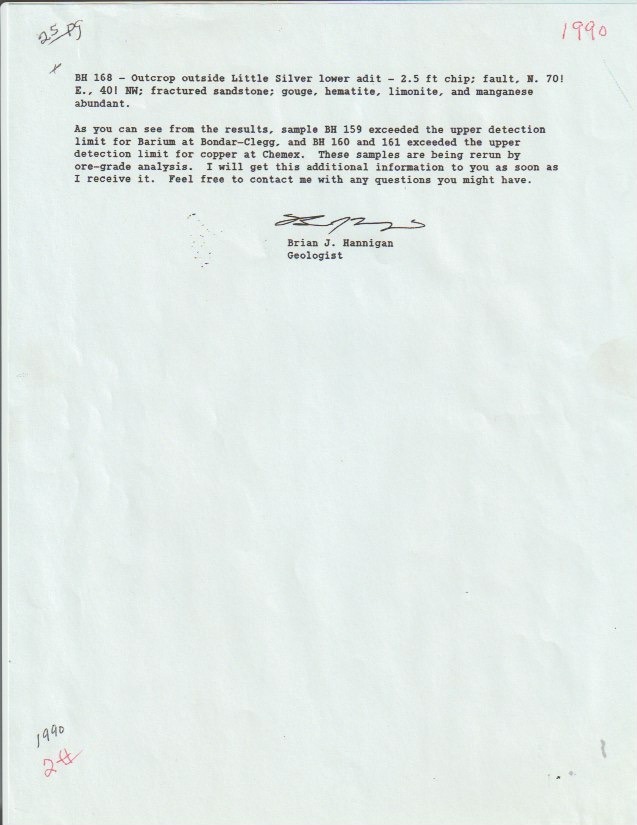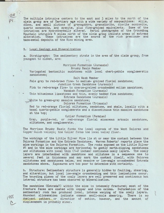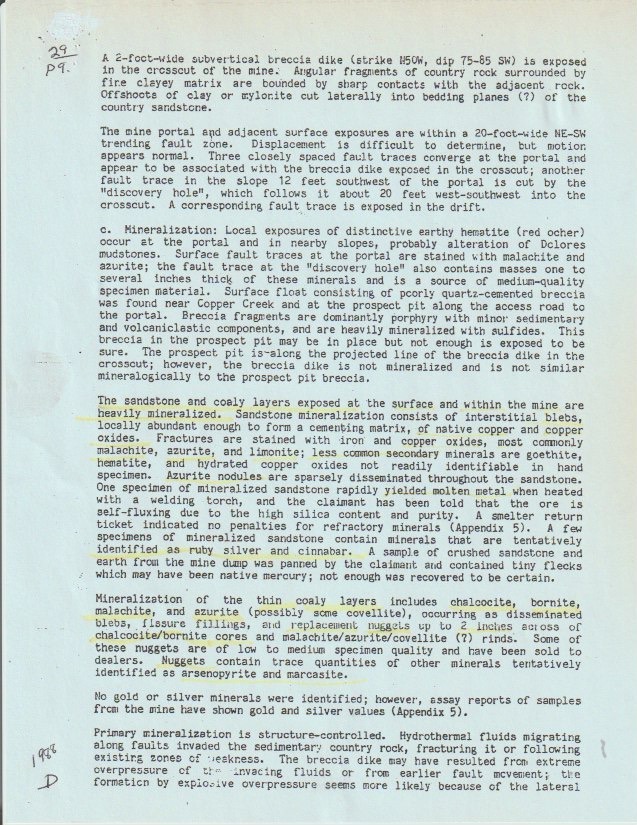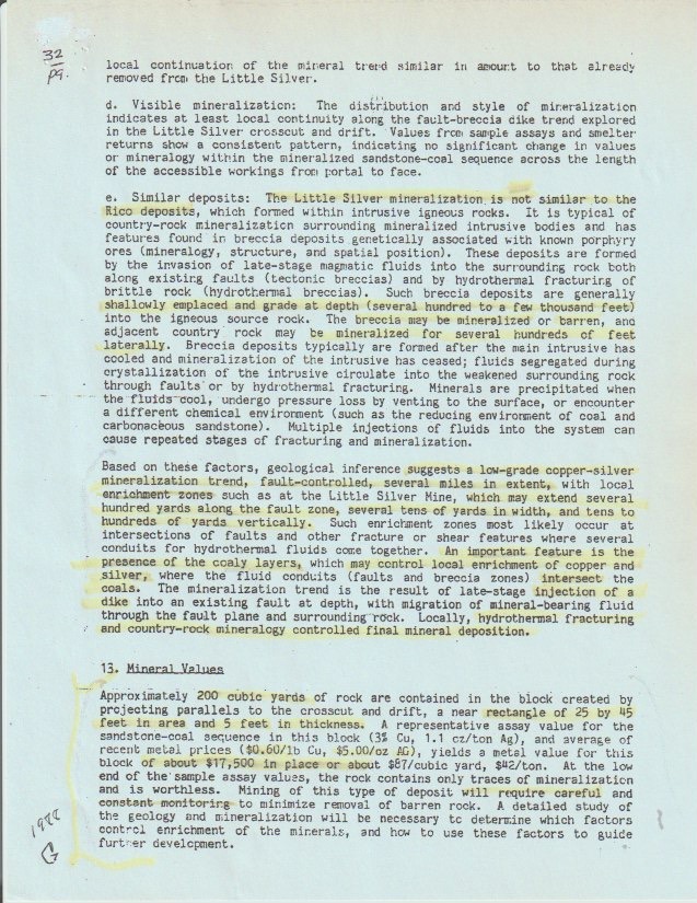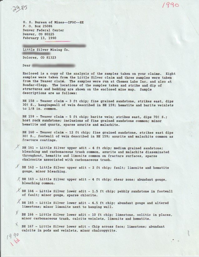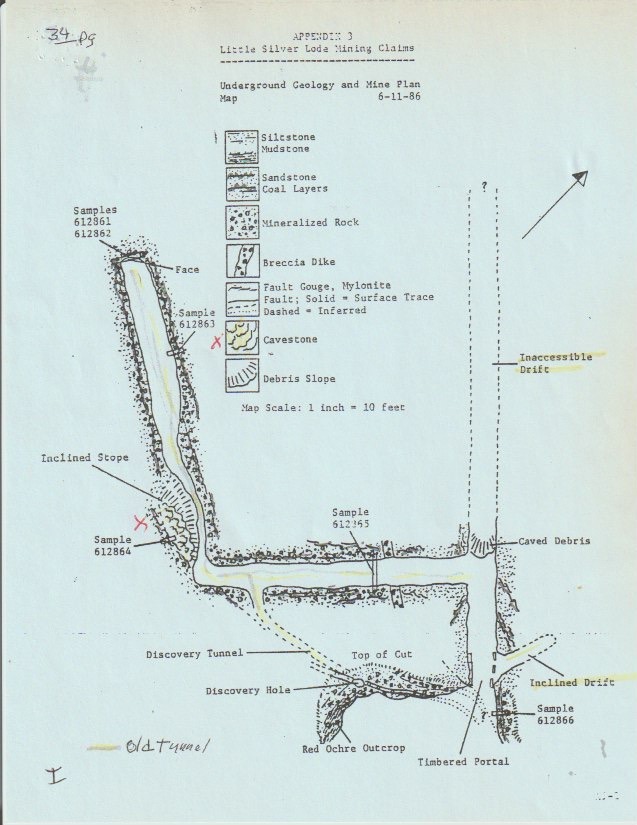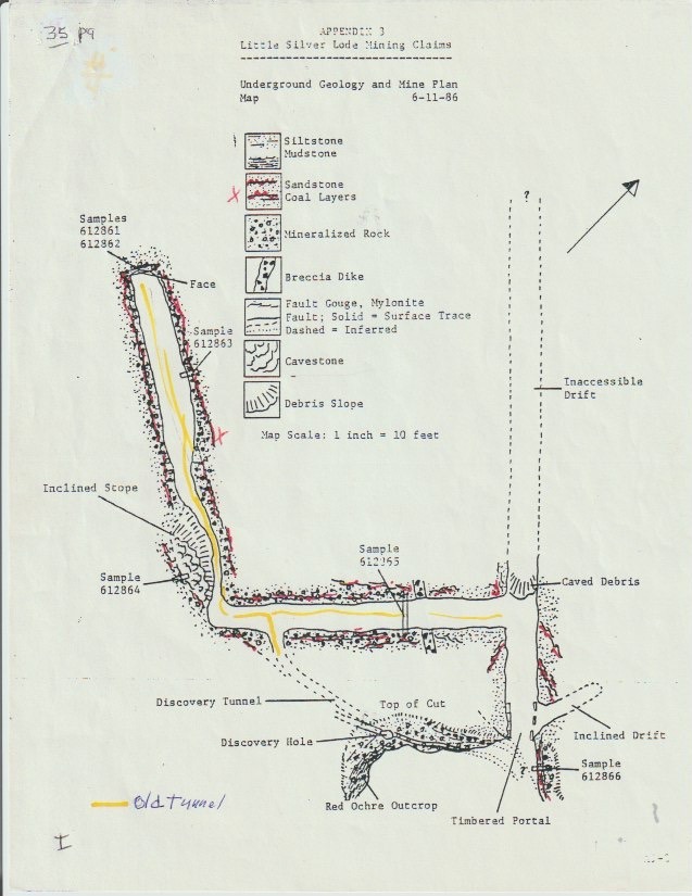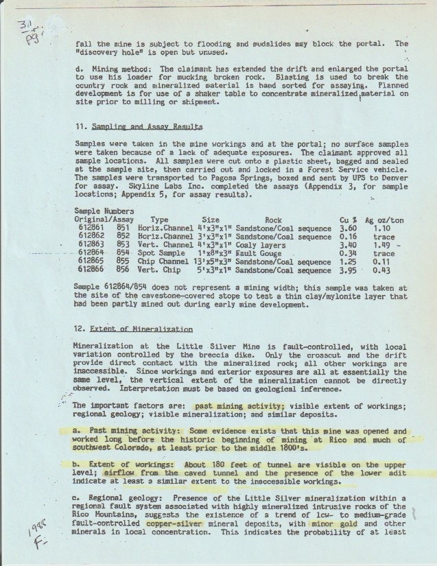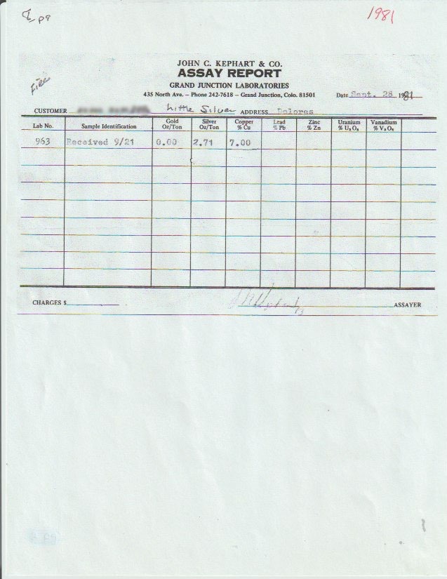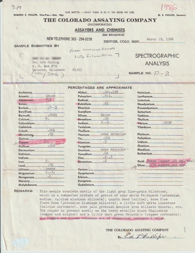 But there's more for show under the earth here. The 1986 Colorado Assaying Company spectrographic analysis described the host rock as a fine-grained siltstone of white feldspar, quartz sand, flake mica, and soft limestone —