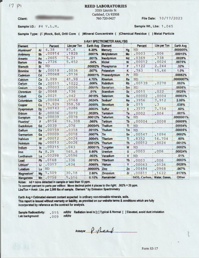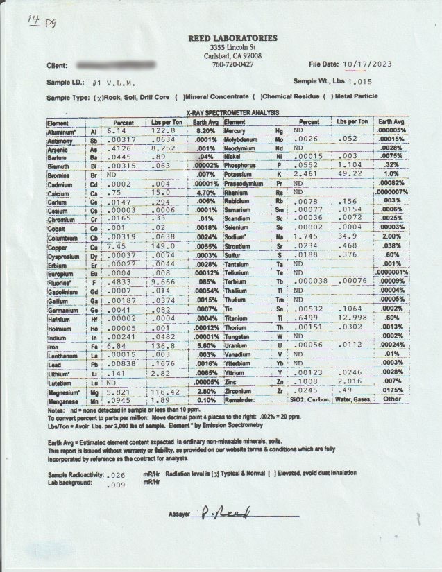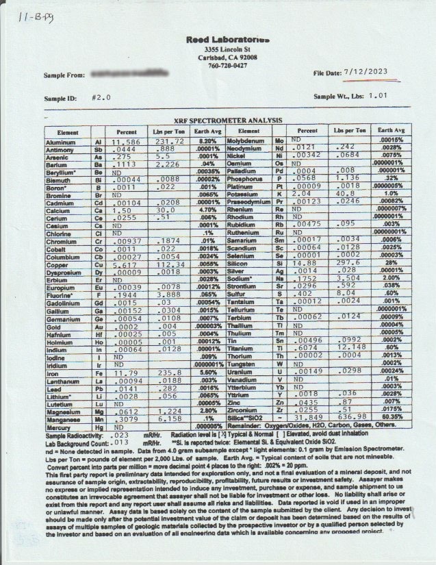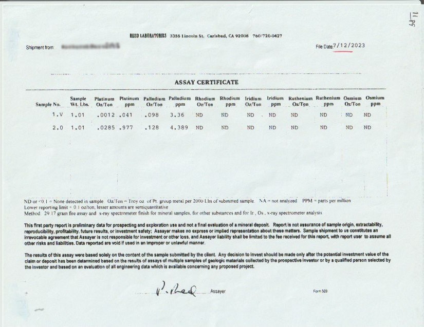 • Platinum Group Elements & Barium - Platinum (up to 0.041 oz/ton) and palladium (up to 4.389 ppm) were detected in 2023 PGE-specific assays — an unusual and potentially significant finding for this type of deposit that was never tested for in prior examinations. The presence of barium further increases profitability by reducing worthless gangue material per ton if processed.