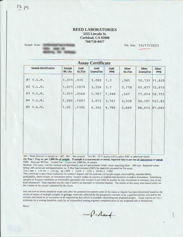 • Exceptional Assay Values - Modern Reed Laboratories analysis (2023) returned copper from 5% to 33%, gold up to 0.14 oz/ton, and silver up to 3.83 oz/ton (3-5%!). Federal assays and personal assays showed consistent precious metal values with striking outliers— this isn't a single lucky grab sample, it's a mine with a good head.