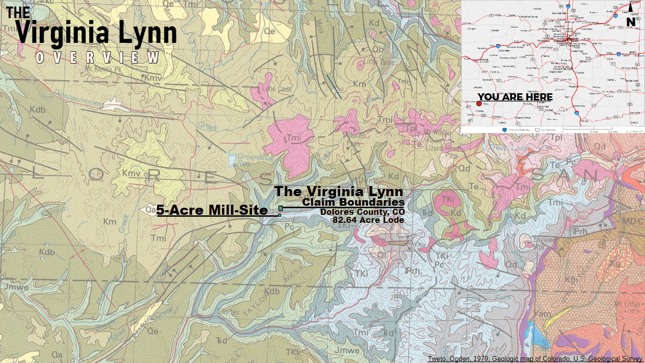 The claims find themselves centrally located on an extensive fault network on the San Juan Mountains, created from the clash of the intrusive San Juan Volcanic Fields and the pre-existing Mesozoic/Paleozoic rock structures. This clash created huge faults spanning for tens of miles all around the claim, and left a particularly dense cluster of breaks that Virginia Lynn sits square on top of. This fault network hosts some of the highest-grade copper deposits found in recent history. Silver is found in commercial quantity, and gold is sprinkled within.