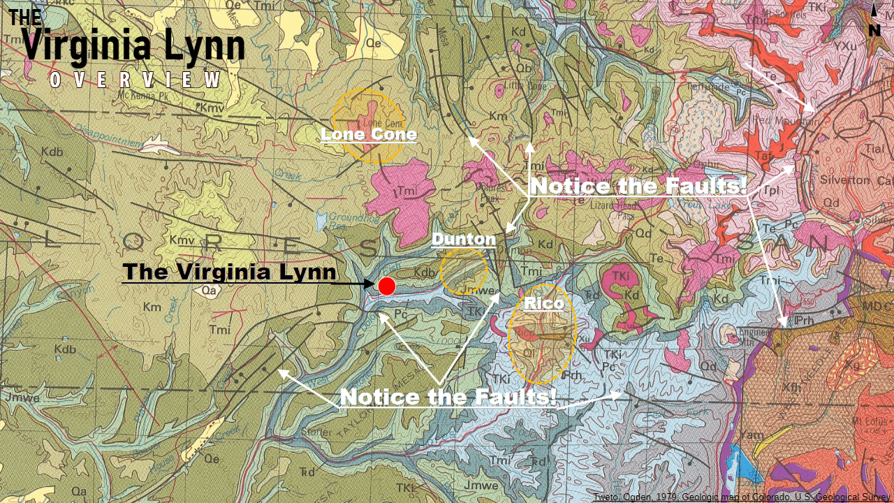The Virginia Lynn claim group lies near the Rico Mountains intrusive complex, at the center of an extensive fault system on the Willow Divide with subparallel and continuous faults radiating 20 to 30 miles to the East and West from where the Virginia Lynn sits. This intrusive complex is the geologic engine that powered the legendary Rico and Lone Cone mining districts to the East, and their rich precious-metal deposits -- of which the Virginia Lynn is directly connected to!