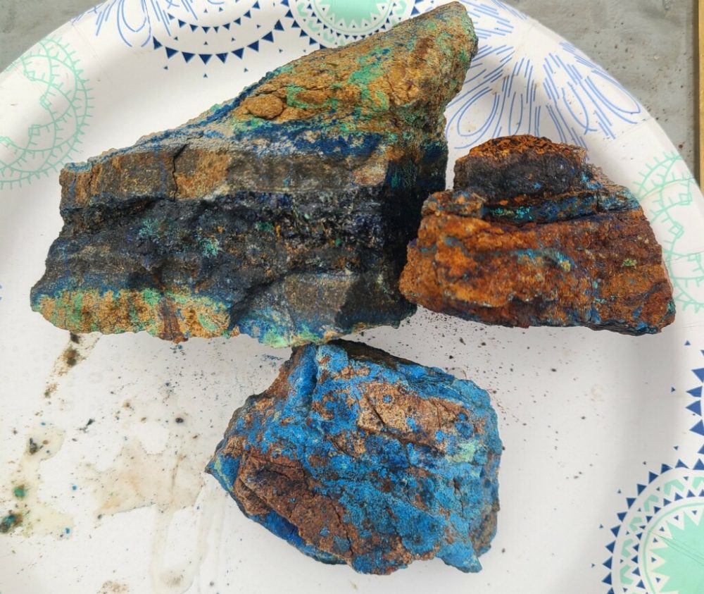 The mineralization seen here produces something uncommon in the world of copper deposits: nuggets up to two inches across with dark, heavy chalcocite and bornite cores wrapped in vivid blankets of green malachite, deep blue azurite, and possible indigo covellite. That kind of natural color zonation — black to iridescent purple to green to blue - suggest five separate combinations of copper and minerals that create beautiful palm-sized specimens; a hand-held kaleidoscope of the mineralogy under the feet of everyone hiking the Willow Divide.