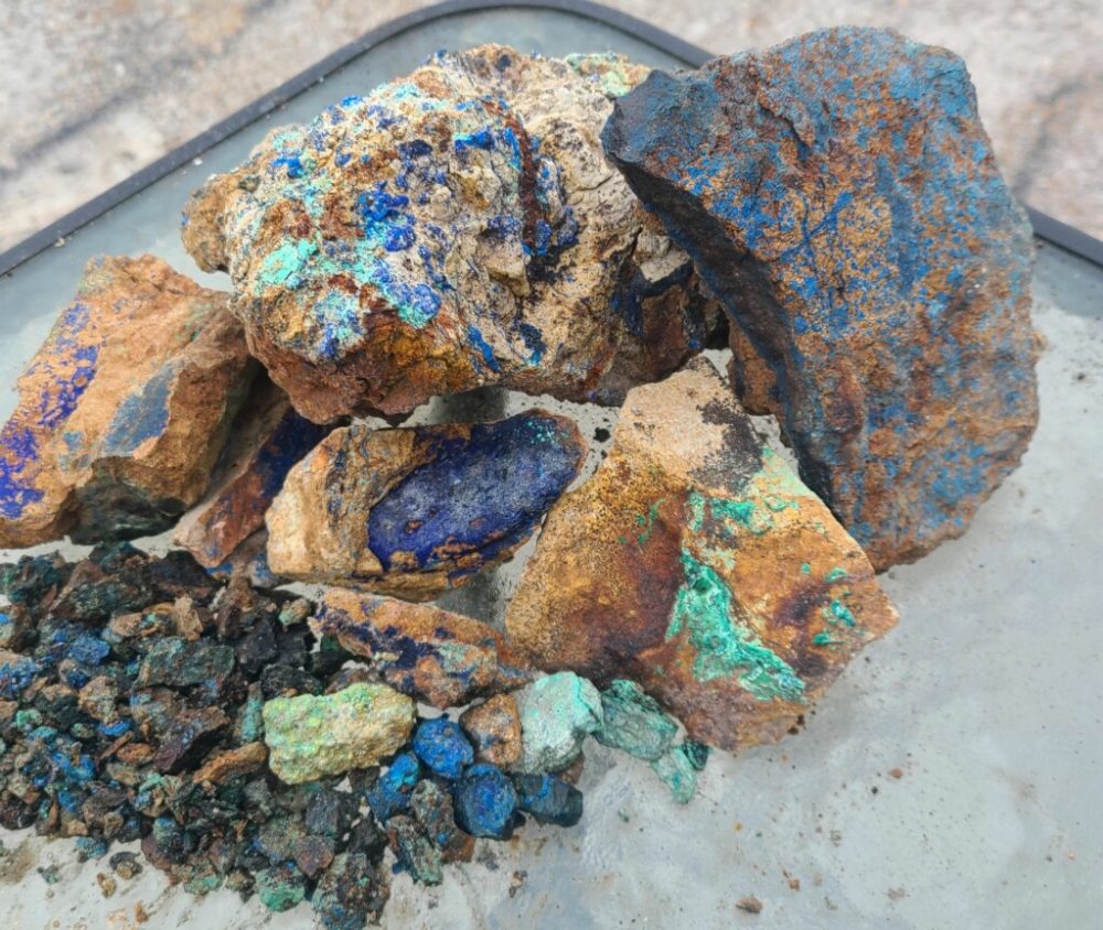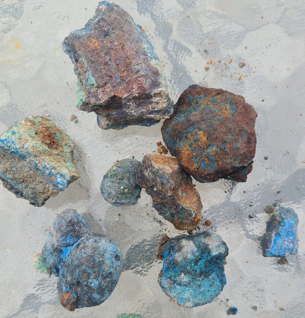 • Specimen-Quality Minerals - The mine produces nuggets of chalcocite/bornite cores with heavy malachite/azurite rinds up to 2 inches across - but these are just the nuggets of the mother ore! Some specimens have already been sold to mineral dealers, and smaller ones at farmer's markets, but the best ones have yet to be seen.